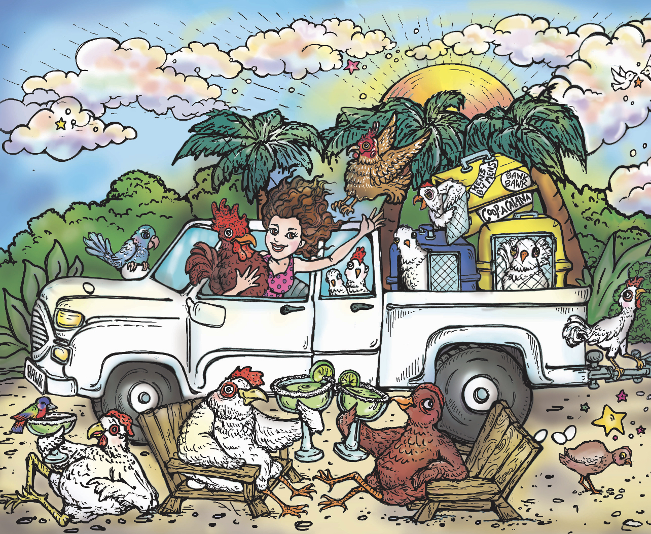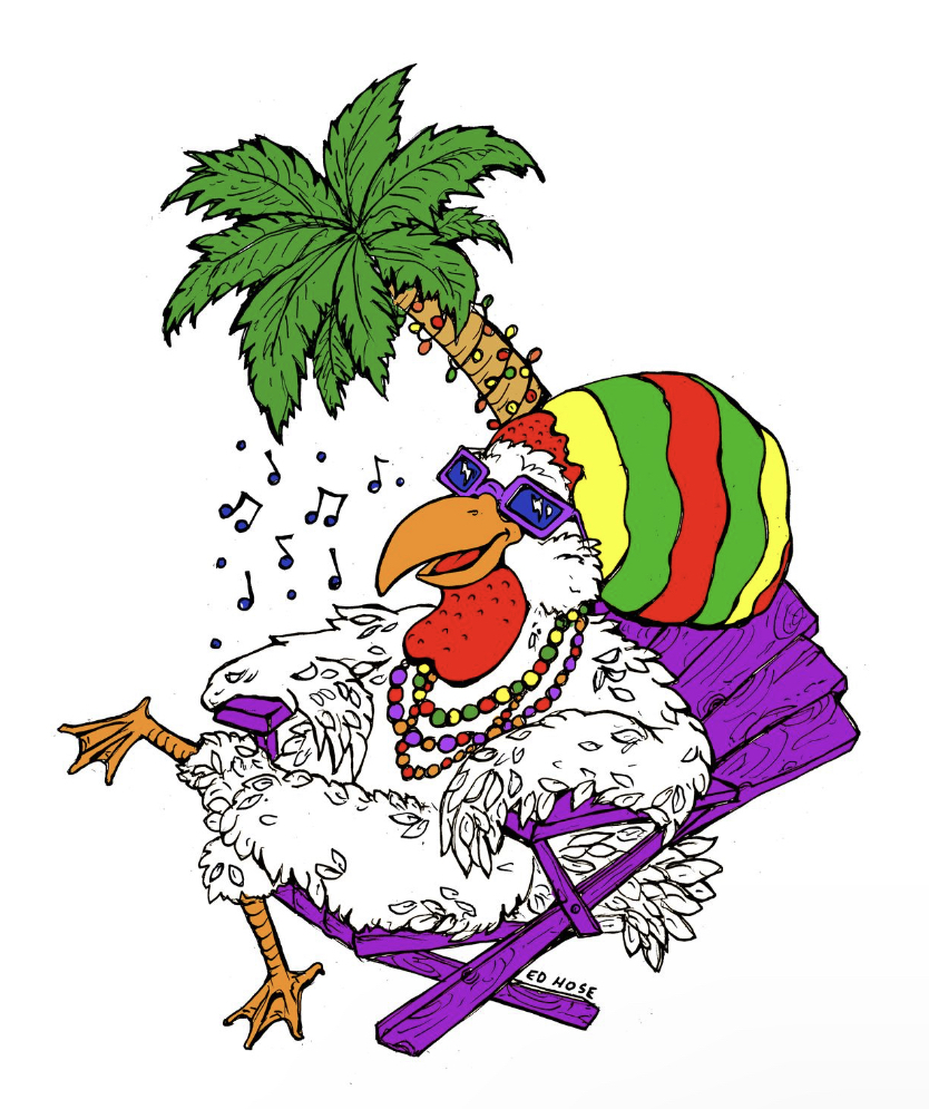 The above chicken illustrations are part of a commissioned piece created for a beloved chicken loving friend and her traveling chickens , and from an old tee shirt I designed for a Caribbean restaurant.