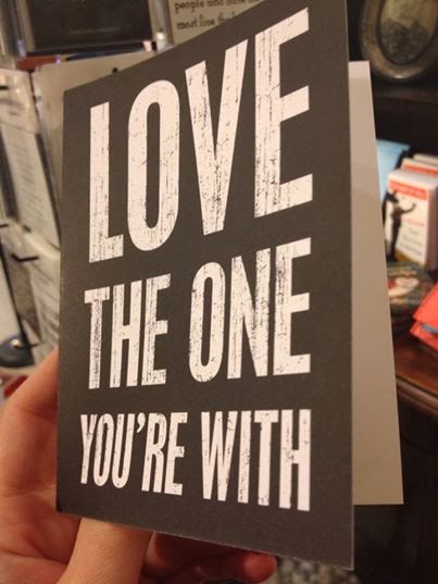 A few days ago I was in a store looking at Valentines. There is a particular brand of card that I love with bold writing and great quotes, philosophies and song lyrics…I shuffled thru the rack and then came upon one that read “Love the one you’re with”.