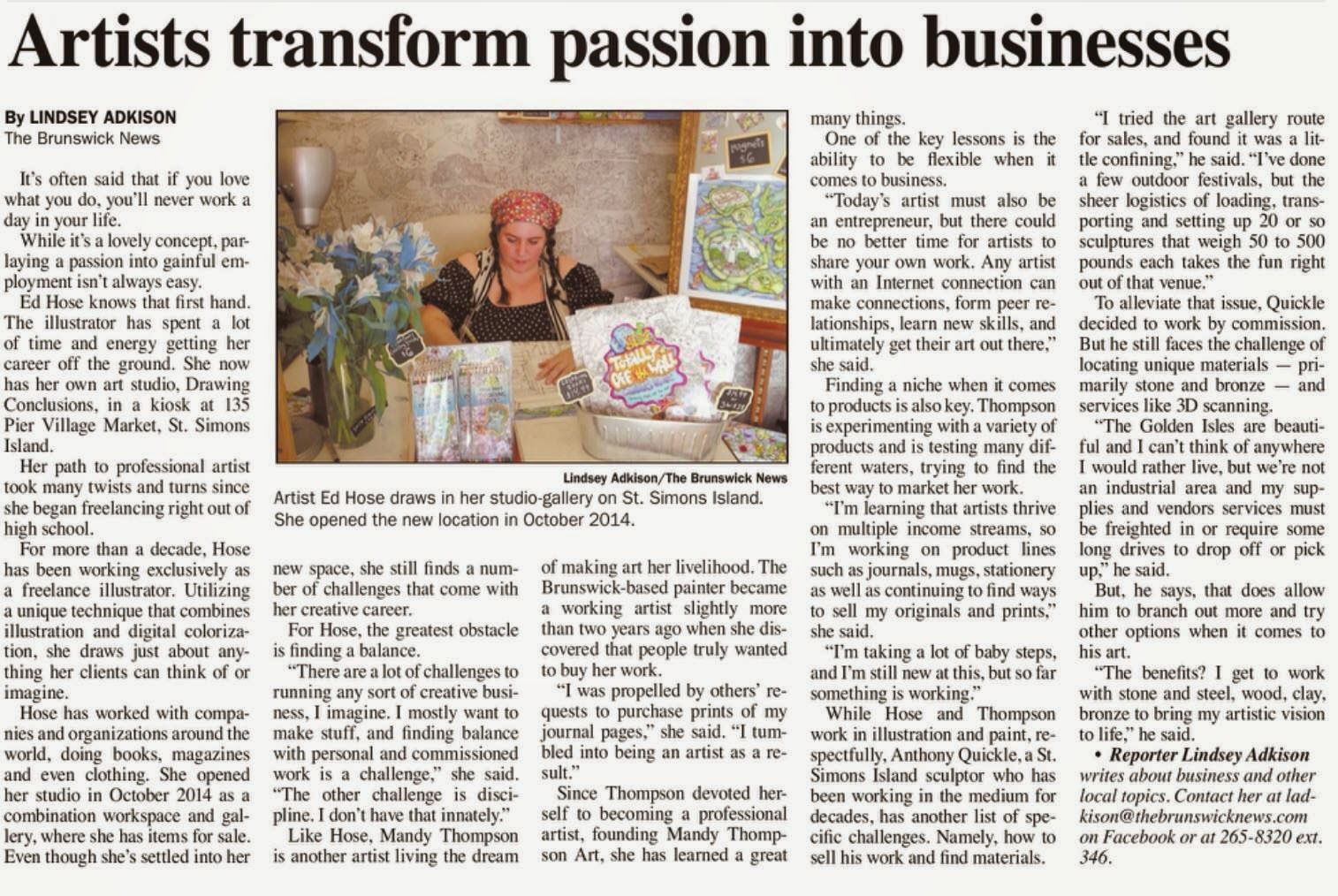 I was actually already thinking about how much I never think about this. Because just a few days ago I was interviewed by The Brunswick News along with some of my other favorite artists Mandy Thompson and Anthony Quickle. We were asked about running an art based business, specifically what are the challenges of being an artist.