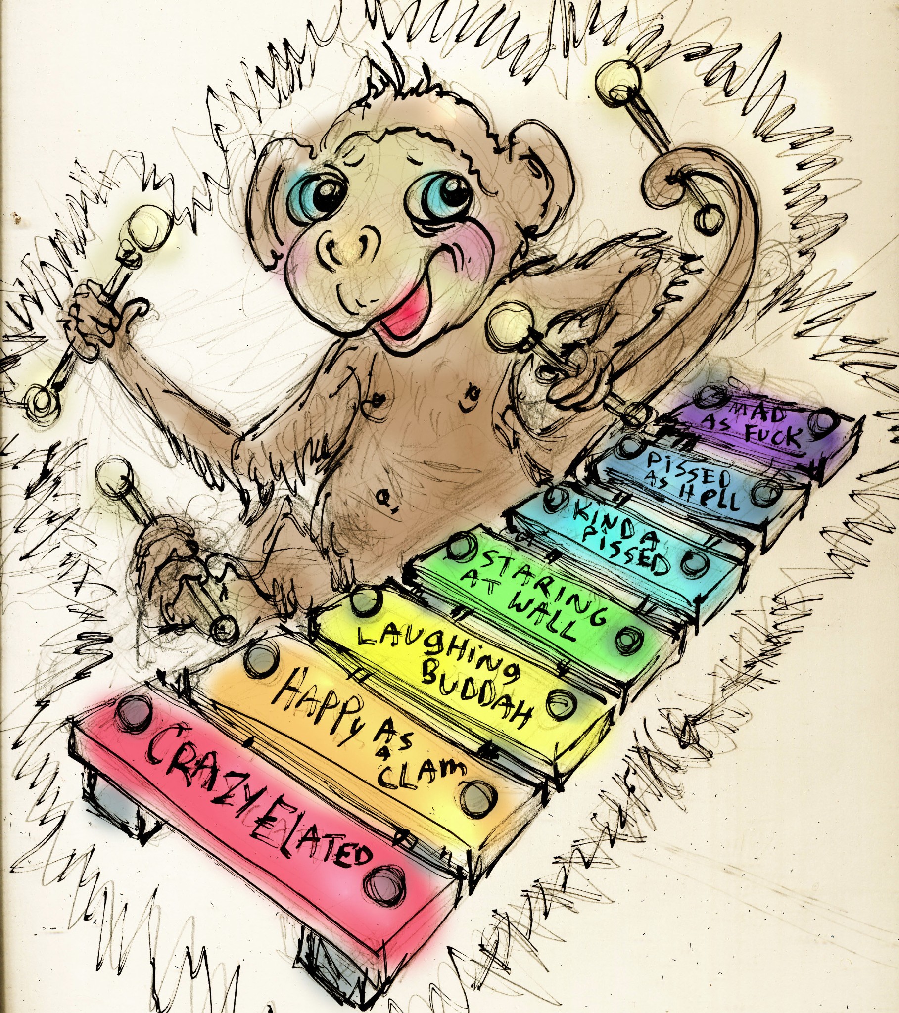 I have drawn the conclusion that we should strive to have all of the known moods laid out like a xylophone to be banged upon by a baby monkey. Being moody is a glorious gift, it should be honored as an achievement. To hit every color, every note. Moody should be a compliment, revered as showing depth of character……Imbalance comes from lingering to long on the same note….not from hitting a so called bad one.