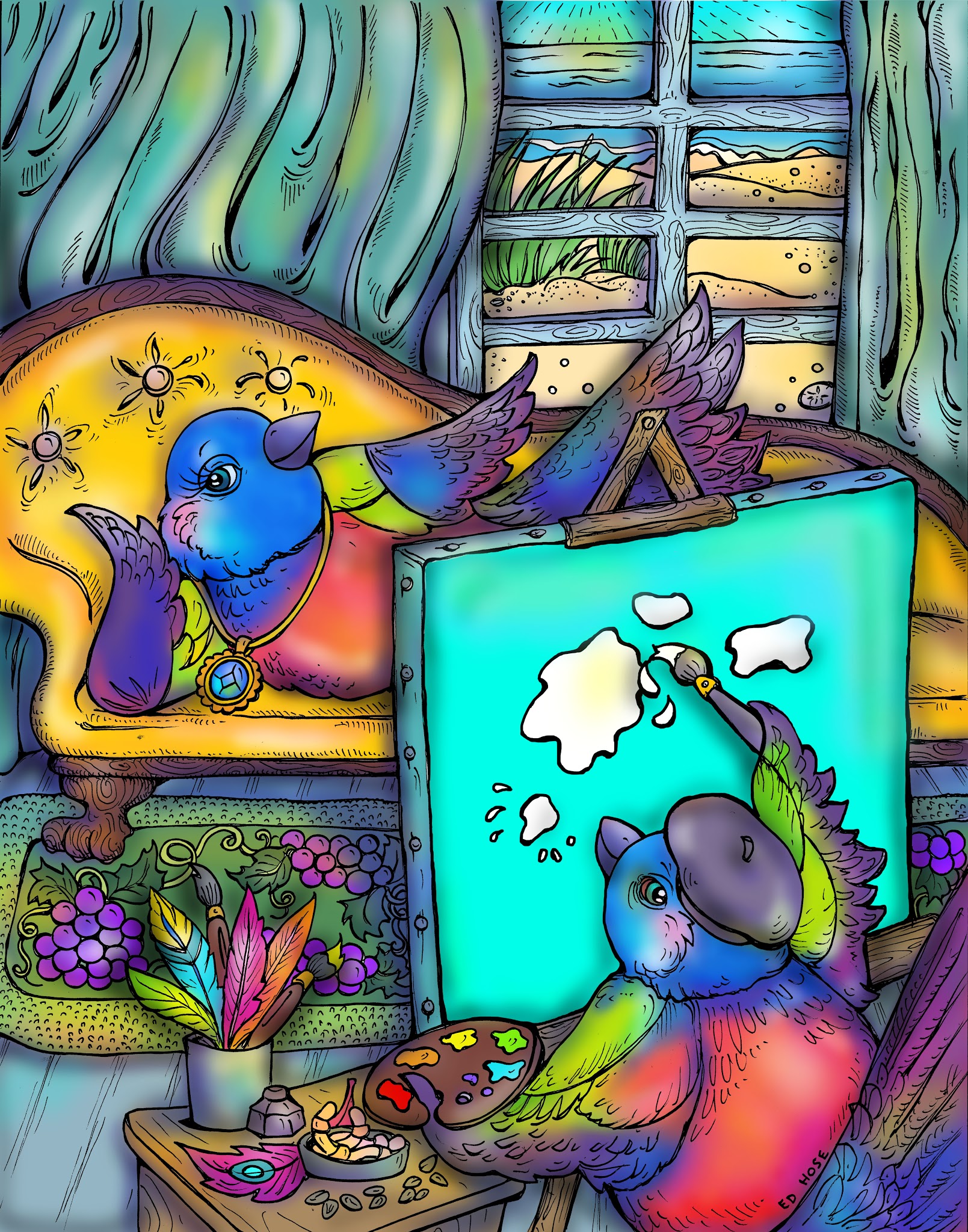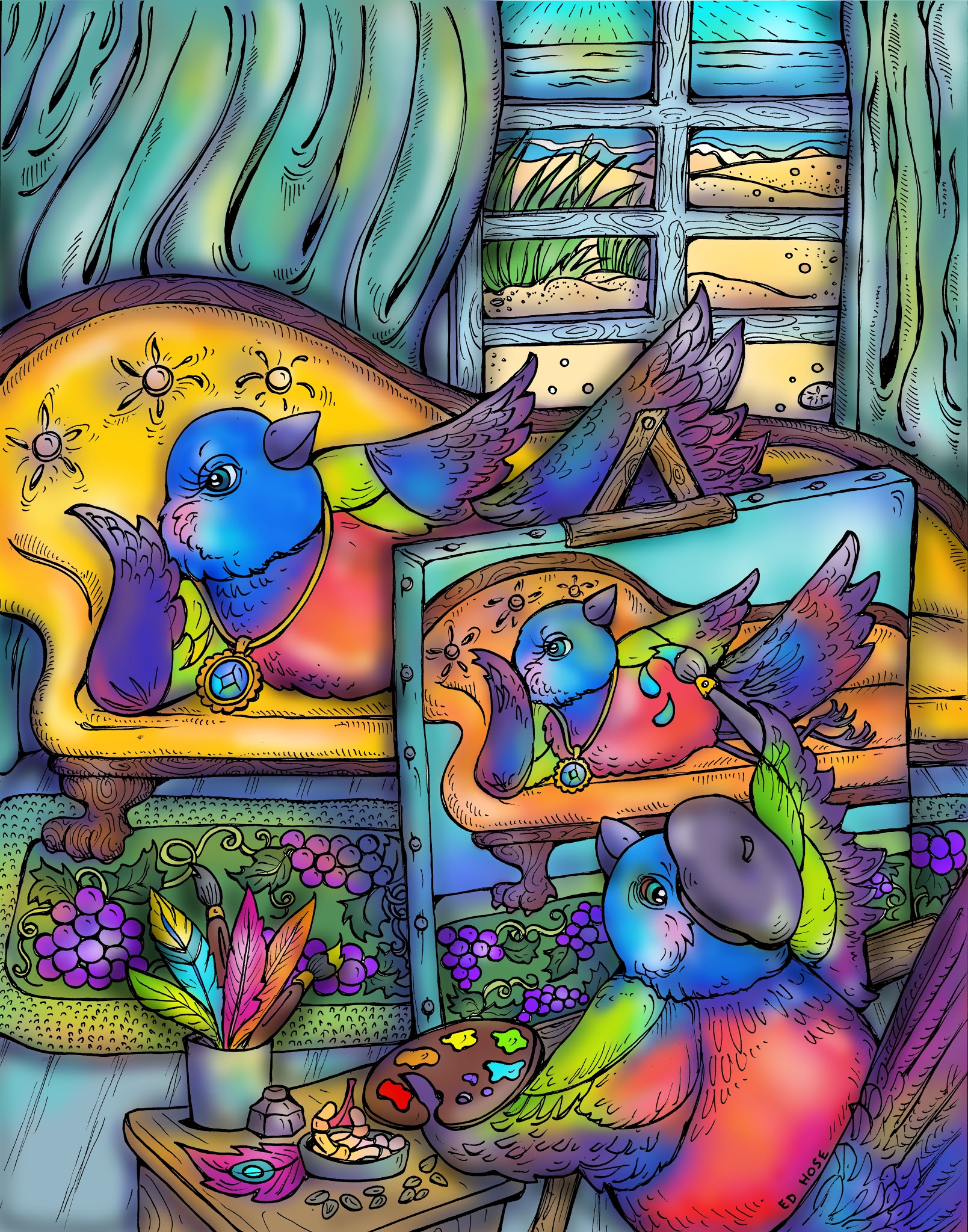 I painted this painting of a painted bunting, painting a painted bunting. and I like it ok. but just when I finished, I realized it would be funnier this way. Dang.