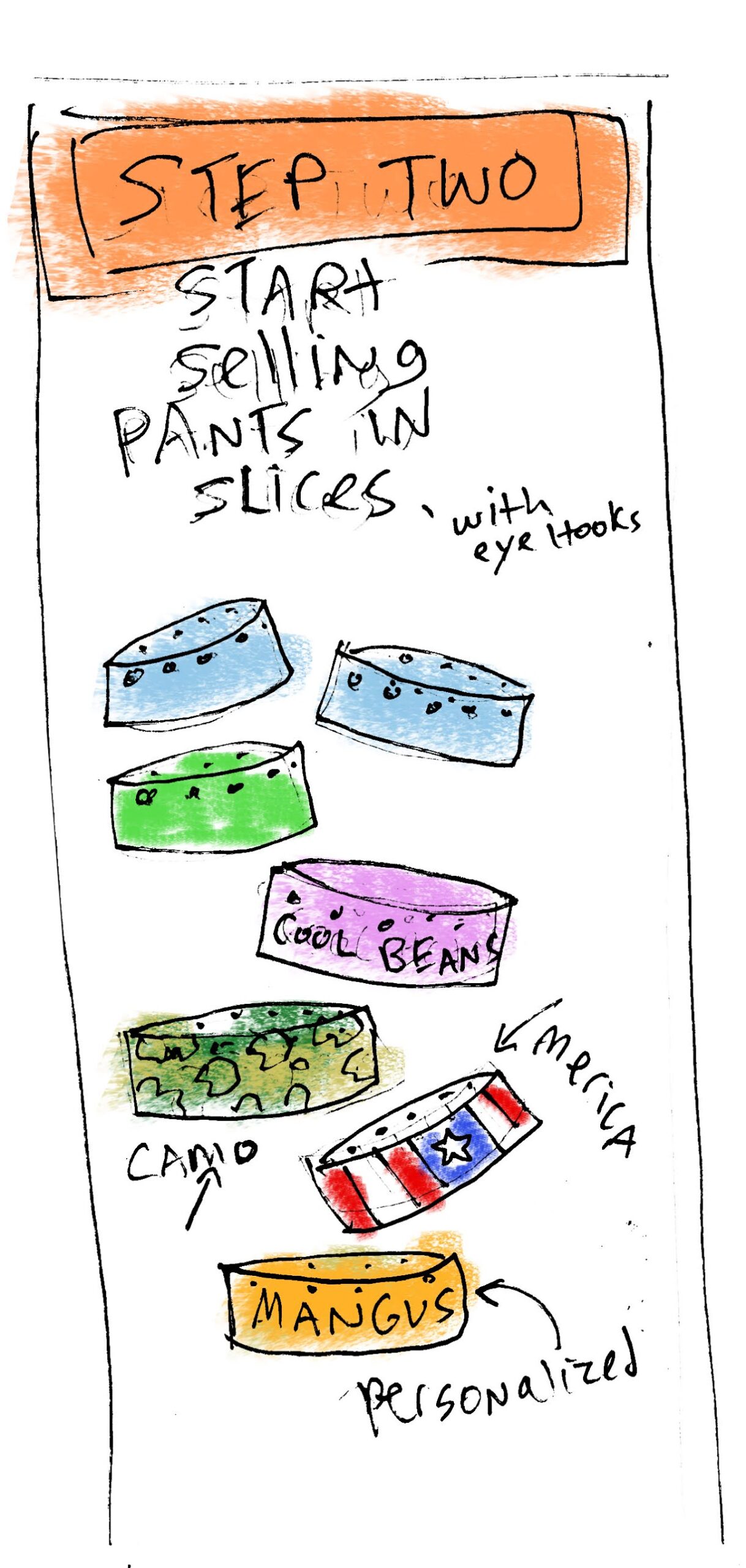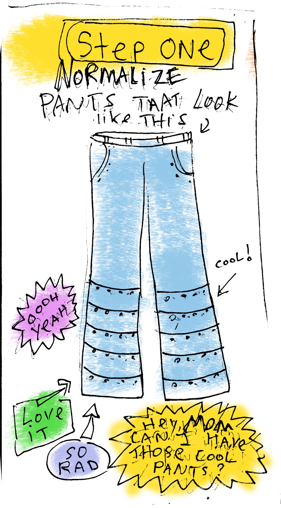 So a year passes. We see celebs kids grabbing ice cream in these strangely layered pants. All the famous tweens begin to wear them and the demand for sliced pants grows feverishly. Sliced pants are the new Tamagotchi!