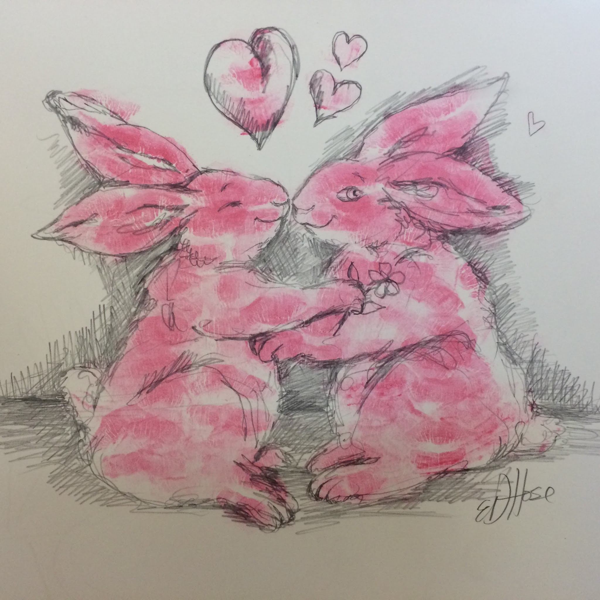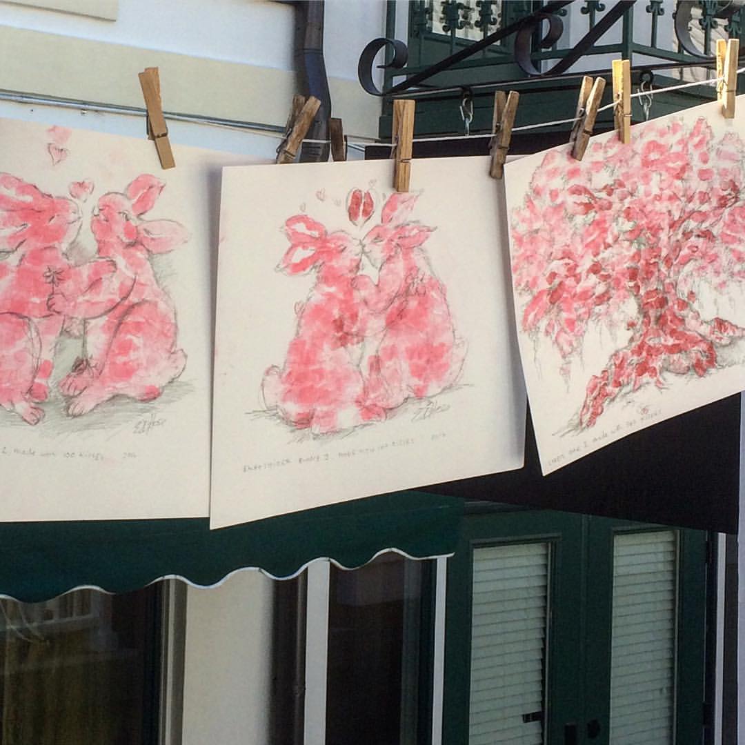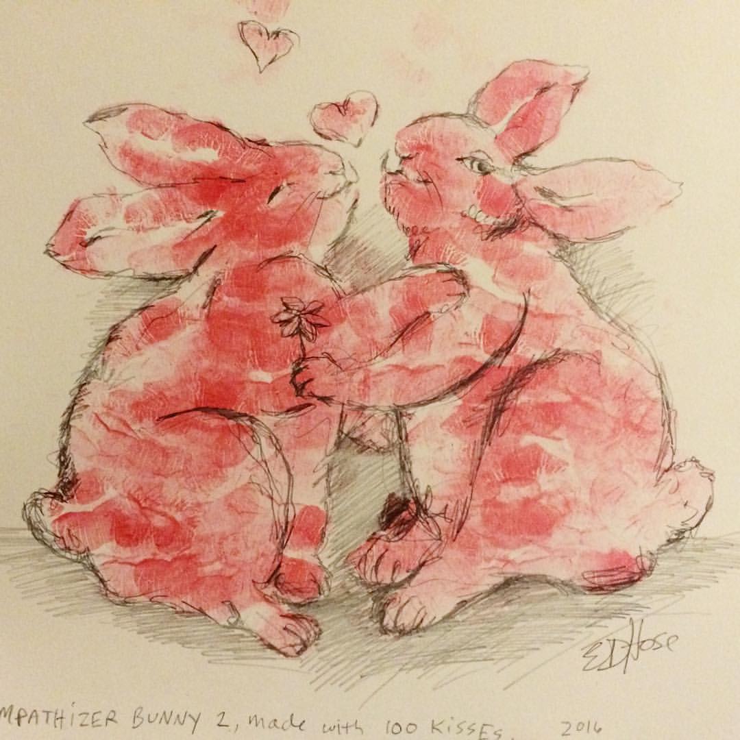 I became obsessed. I’ve been kissing paper all day. Over and over again, this empathizer bunny made of kisses, just keeps happening. I sold 4 of them today, all with their own specific idiosyncrasies. I like to think of people around the world all sharing this common thread with each other. Not knowing who, but knowing somewhere out there is this giant family of kissed up bunnies, reminding people to love one another. It feels like a movement, I made so many of these bunny kisses today. They keep multiplying at a rate so fast its like….