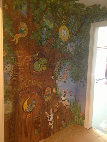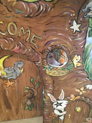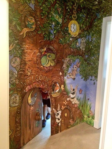 I was hired to paint a tree on a wall in the entryway a few weeks ago. On the first visit, I outlined a door and some windows and the construction crew cut them out and hinged them from the inside. This wall is a thick plywood and was already primed and painted for my arrival! The doors and windows lead to a two story playhouse, with a ladder built in…This is where other families might have their pantry…..the alternate doors lead into the kitchen so parents can keep an eye on the twin toddlers inhabiting the treehouse.