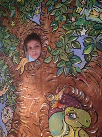 Here is a detail, I made my own sons model… rubbing in the fact that they don’t have anything near this cool in their own house . Ogden is peeking out a tree knot that has a fish reading a book and you can see the message in the bottle, painted to stimulate creative minds ” I wonder what is written in there”?
