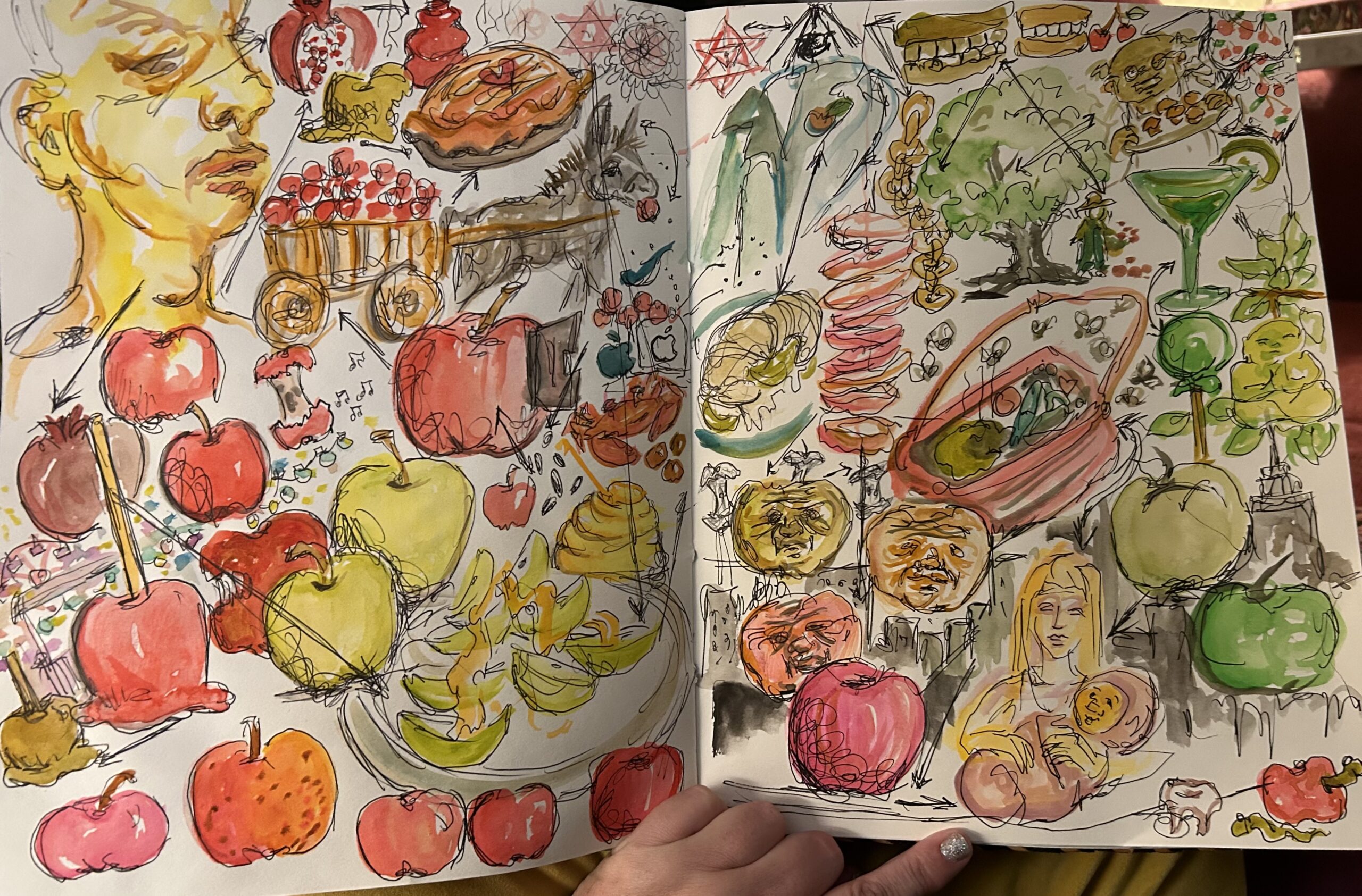 If someone were to say “visualize an apple”, I see a swirling tornado of every apple I have ever eaten. Not just the ones I have eaten, but the ones I have thought about, feared, and longed for. I see the caramel apples at the fair, I also see the lights and hear laughter and music, I see the candied apples that I don’t know how to eat but they look so beautiful as they rip your teeth out. I see the bloodied apple of my sons loose tooth that finally, on a bold chomp freed itself from his gums, I see the apple but I don’t see which kid, and I then think I am a terrible mom for not even knowing which kid of mine lost his tooth in an apple, but I am reeled back in thinking of cut green apples dipped in honey that got my kids to eat something other than a chicken nugget and I feel like a good mom again. Seeing apples and honey provides a layered montage of all the apples and honey plates consumed in a lifetime of Rosh Hashanahs. And then I see peanut butter, and cheese on crisp apples eaten creekside on a back country ski, the apples at the bottom of my bag that rescued me over an over again from bad decisions. I see the apple at the bottom of my bag that I forgot about. I smell that forgotten apple and all the rotten apples I have come across. The furry apple covered in mold lost under the seat of my car . Because I see that furry apple I see a girl at the club, dropping it low in her apple bottom jeans with the fur. I see the protrusion of an adams apple and then of course I see Adam and eve and their apple, and I see atoms swirling around Adam then I see a pomegranate, because that is more likely the biblical apple and next to the pomegranate I see all of its seeds or fleshy bits and how hard they are to access and what a great reward they are like little jewels, so they sparkle and next to them the womanly shape of the Pom Juice bottle in the supermarket and the sense of fertility and family that comes with the fruit, I see the pomegranates that I have gifted for housewarmings and I see all the symbolism of a pomegranate flashing before me, the jewishness, the sacred geometry suddenly a merkabah appears. Merkabah shows up everyday somehow so it doesn’t surprise me . A hebrew word for chariot or cart and maybe it explains why I see a donkey pulling a cart of apples, the apples spill everywhere and I see a hand reach out and feed the donkey an apple. I see all the apples I have ever fed a horse or donkey, I feel their horse lips in the palm of my hand. The apples makes me see a horse the horse makes me see feeding it an apple.